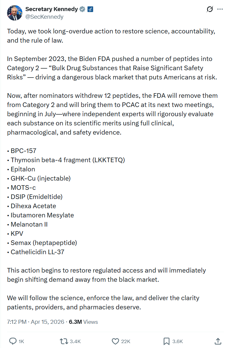 On April 15, 2026, U.S. Secretary of Health Robert F. Kennedy Jr. announced that the FDA would remove twelve peptides from restricted Category 2 status.
