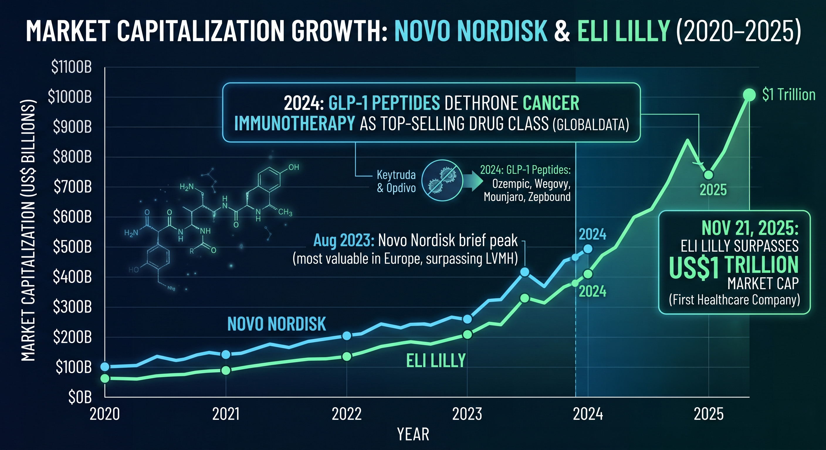 Tirzepatide, the GLP-1 in Zepbound and Mounjaro, pushed Eli Lilly past US$1 trillion in market capitalization on November 21, 2025 — the first healthcare company in history to cross that threshold⁷.