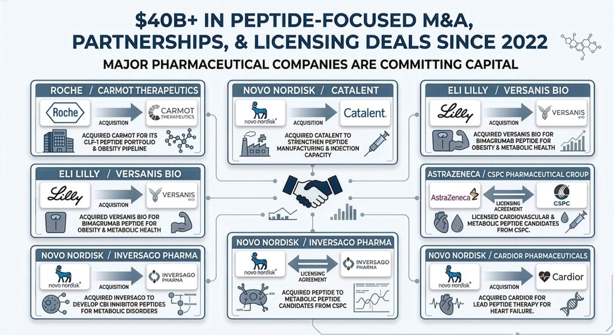 And Big Pharma has been voting with capital. Since 2022, the disclosed value of peptide-focused M&A, partnerships, and licensing deals across the major pharmaceutical companies has exceeded US$40 billion¹⁵.